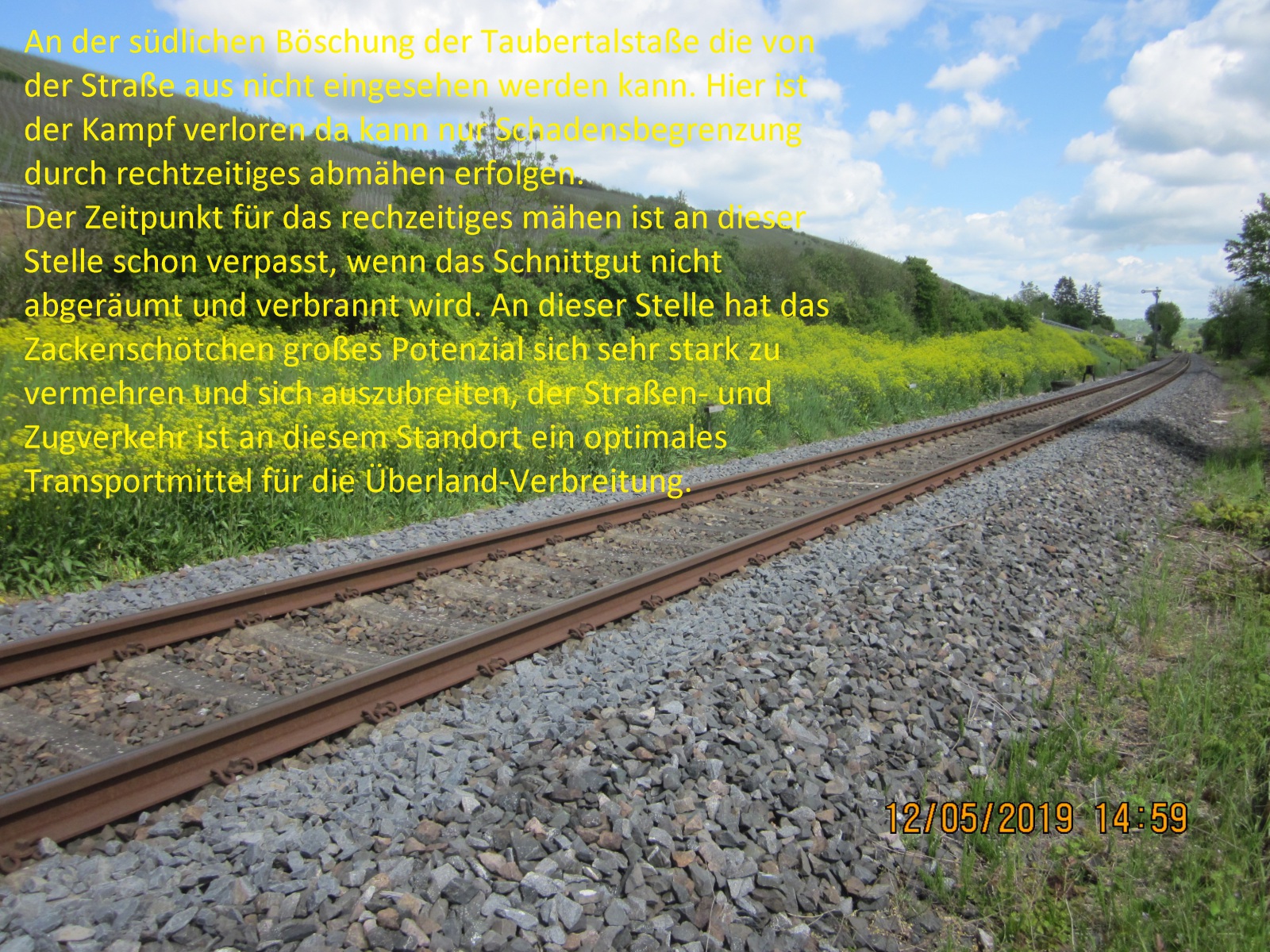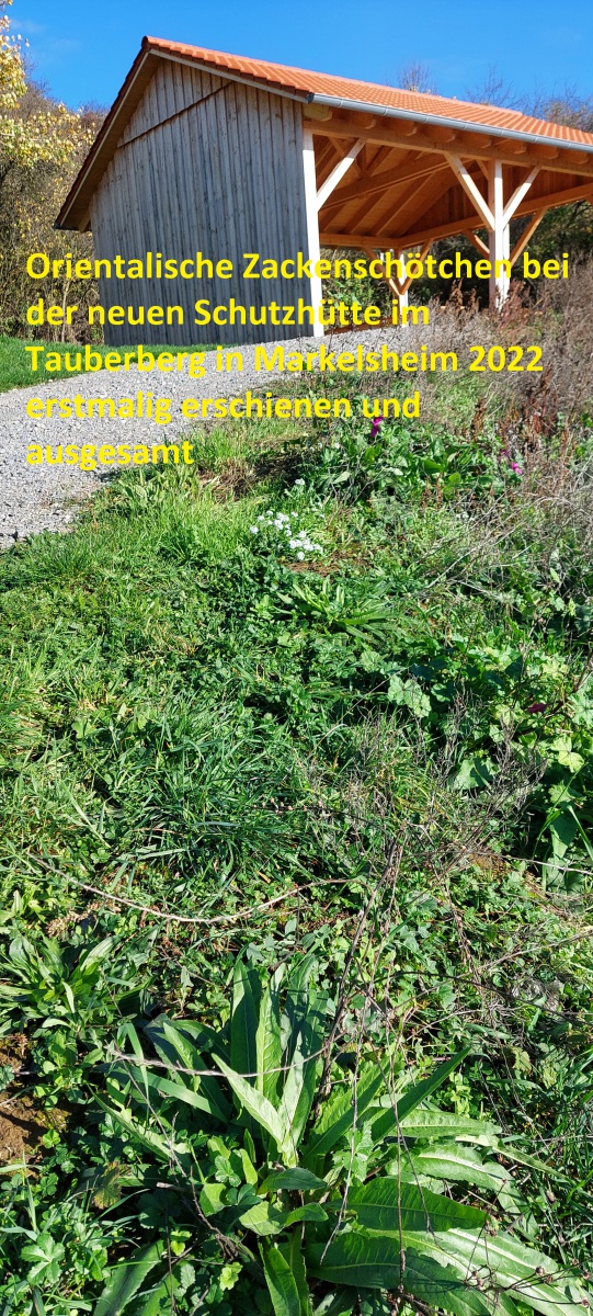 In Markelsheim entlang der Taubertalstraße auf der Böschung, die nicht von der Straße eingesehen werden kann, ist das Orientalische Zackenschötchen (OZ) massiv verbreitet ebenso zwischen Markelsheim und den Kreisverkehr am Kaufland ist es auf der Böschung und angrenzenden Flächen gut sichtbar und weitere Vegetation ist nicht mehr vorhanden. An diesen Stellen ist der Kampf gegen den pflanzlichen Neubürger verloren. Nur durch rechtzeitiges mähen – das aussamen verhindern – muss die Stelle lokal isoliert werden. Nachdem alle Teile des OZ gegessen werden können hoffen Fachleute darauf, dass es als Nahrungsmittel eingesetzt wird. Das OZ hat einen markanten kräftigen Geschmack Sie sollten es einmal auf den Speiseplan setzen, vielleicht wird es Ihre zukünftige Lieblingsspeise und das OZ wird damit bekämpft.