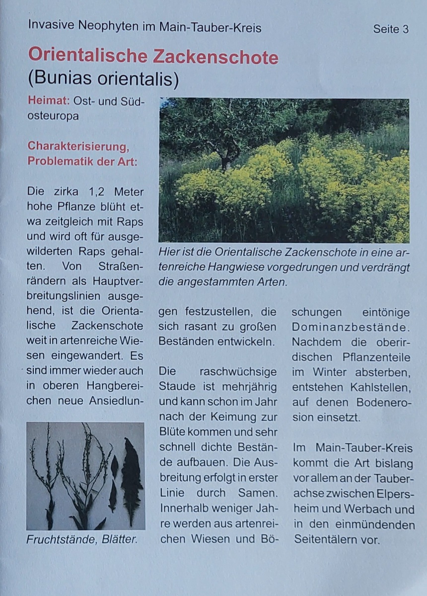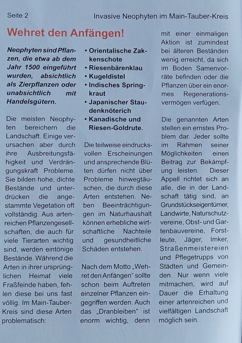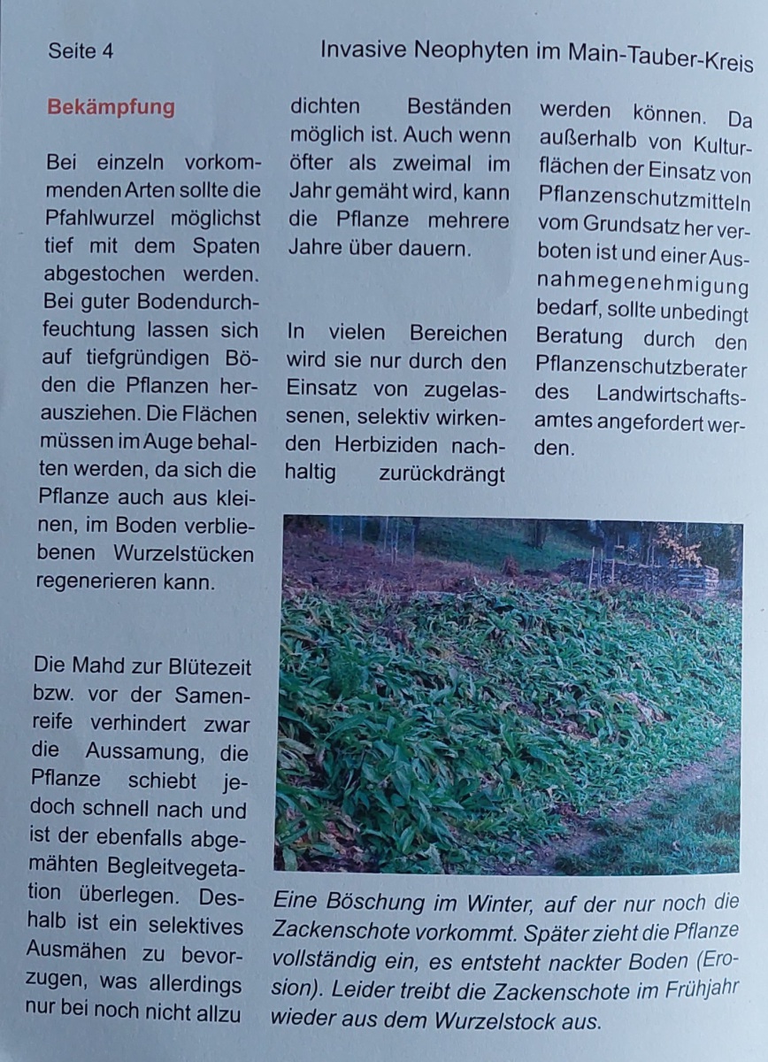 Es ist eine Aufgabe aller Bürger und Landschaftspfleger die für öffentliche Flächen zuständig sind dem OZ Einhalt zu gebieten. Noch ist es nicht überall, das wird sich in den nächsten Jahren verändern, wenn nicht sehr gezielt und nachhaltig die Ausbreitung verhindert wird. Einen Tiefenstecher kann bei der NSG ausgeliehen werden – siehe Bild oben – (eMail an: Info@nautuschutz-taubergrund.de oder anrufen). Das Landratsamt Main-Tauber-Kreis hat eine Schrift „ Invasive Neophyten im Main-Tauber-Kreis “ vor 17 Jahren aufgelegt, das Mitarbeiterverzeichnis ist nicht mehr auf dem neusten Stand in der Sache ist die Schrift zutreffend. Eine kleine Stückzahl ist noch vorhanden und kann angefordert werden.